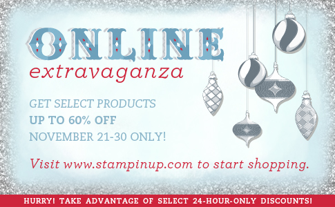 I am so excited!!!! The "Online Extravaganza" with Stampin' Up! starts today!!! There is a 24 hour sale TODAY ONLY and all week long you can save 25%-60% on selected merchandise! Check out the bundles too! This incredible deal is just in time for … [Read more...] about Online Extravaganza starts TODAY!
