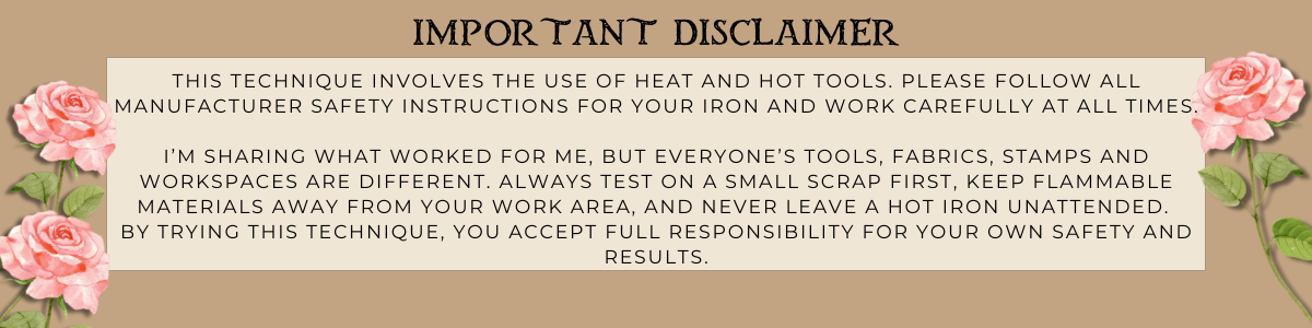 I learned the tin foil method from my friend France Martin (Frenchie Stamps). It helps distribute heat evenly and protects the fabric.