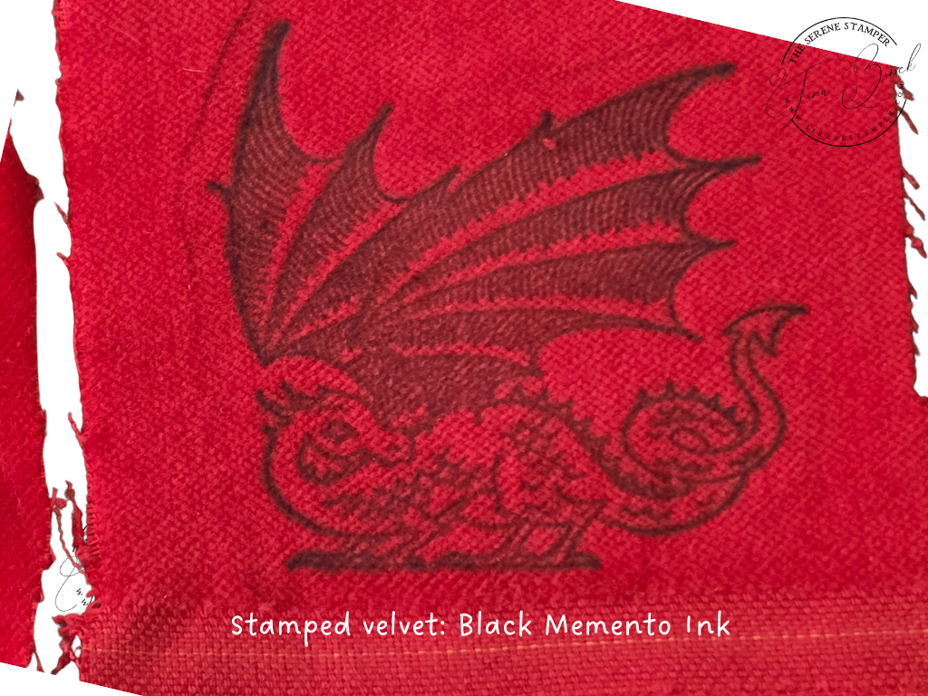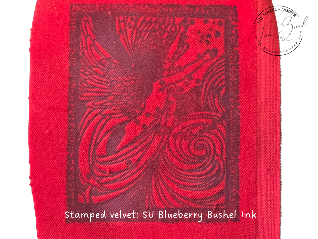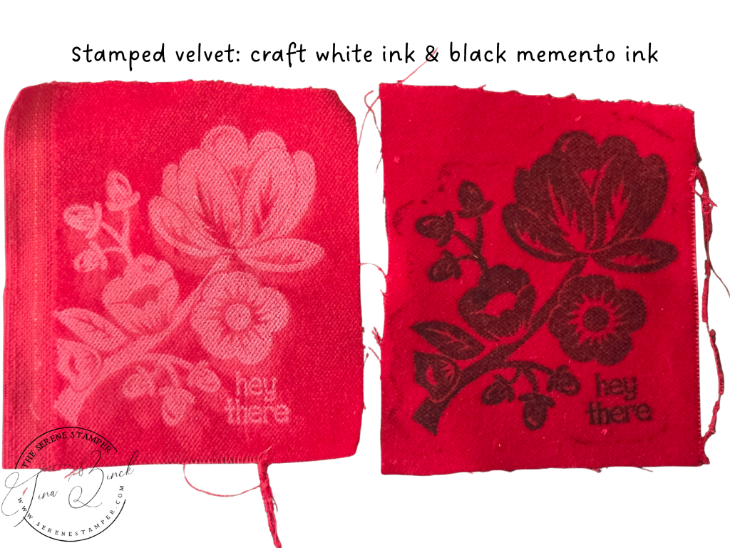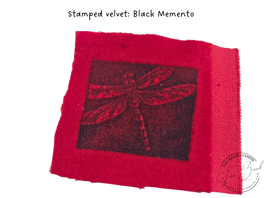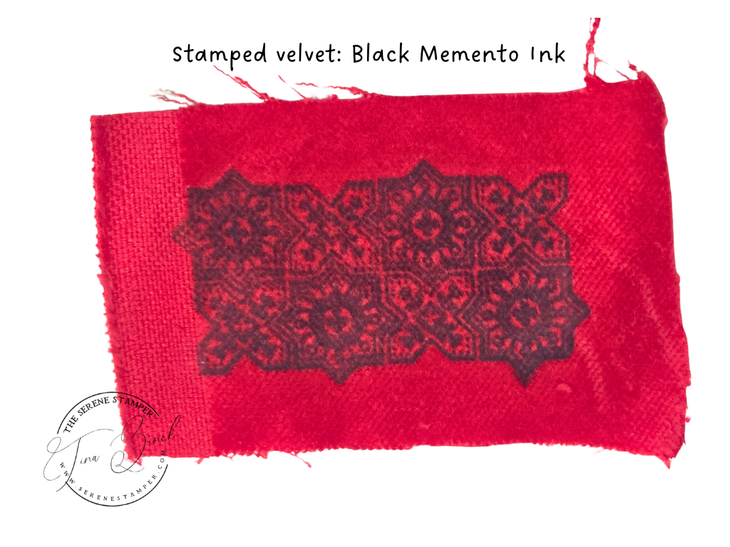 I had so much fun experimenting with ink pads, water, stamps, and an iron to create this beautiful stamped velvet!