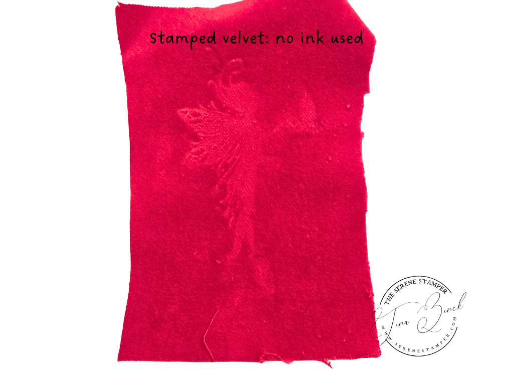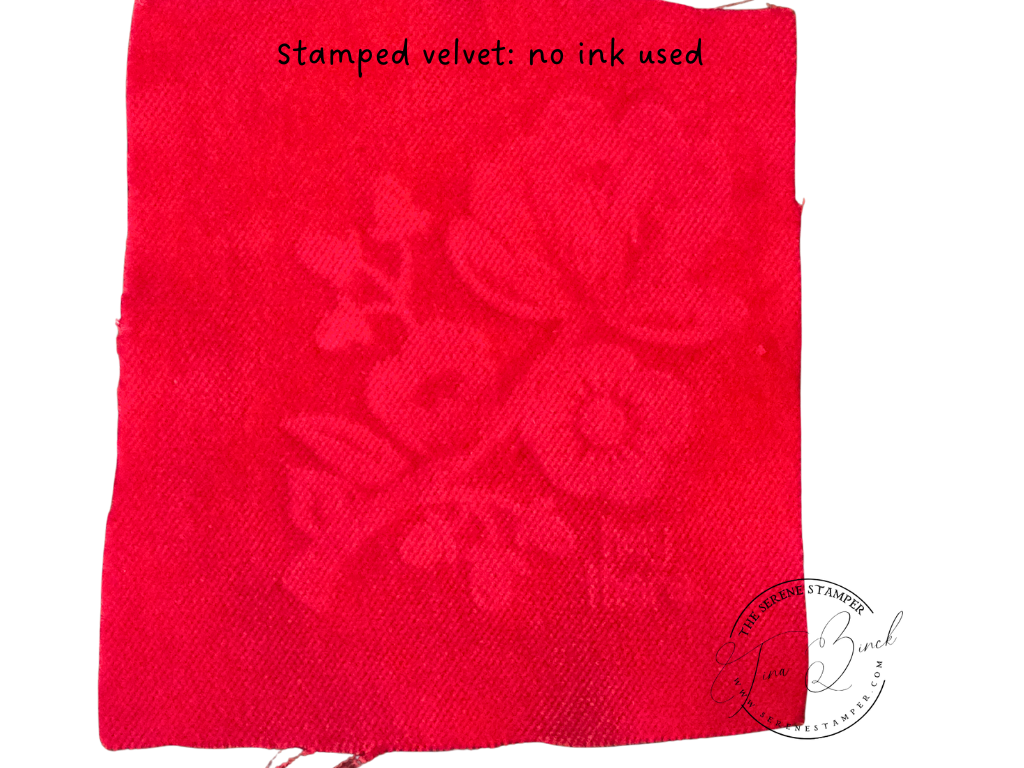 It’s often called stamping on velvet or embossed velvet, and it’s been around for years. There are quite a few different ways to do it, and none of them are strictly right or wrong. What I’m sharing here is the method that worked best for me using supplies I already had on hand.